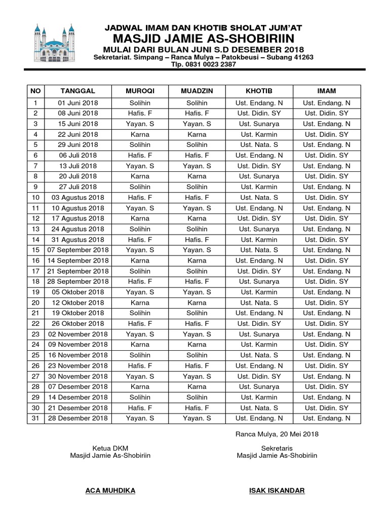 Jadwal Petugas Sholat Jumat Pdf from imgv2-1-f.scribdassets.com Maybe you would like to learn more about one of these? We did not find results for: Contoh format jadwal khotib jumat. Check spelling or type a new query.